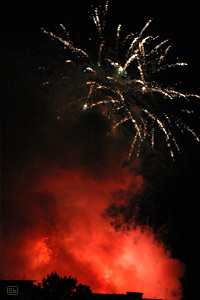 C'était trop drôle parce que quelques voisins que je vois rarement d'habitude, étaient aussi sortis sur leur balcon, les gamins criaient quand il y avait un grand boum et on entendait des aaaaaaaah admiratifs et unanimes pour les scènes les plus impressionnantes. Bref, c'était la même ambiance que quand on se déplace sur les lieux du feu d'artifice, mais avec plein d'avantages: on n'a pas devant les eux les fesses des gamins montés sur les épaules de leur papa, personne ne vous marche sur les pieds, et surtout, on est confortablement installé, une boisson fraiche à la main, l'appareil photo posé sur un trépied... le paradis. Quoi qu'en réfléchissant bien, l'an prochain, j'organiserai ça un peu mieux: glaces Hagen-dasz et bonbons haribo à volonté.