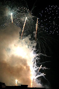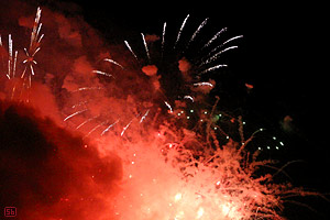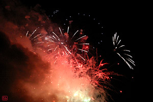 C'était trop drôle parce que quelques voisins que je vois rarement d'habitude, étaient aussi sortis sur leur balcon, les gamins criaient quand il y avait un grand boum et on entendait des aaaaaaaah admiratifs et unanimes pour les scènes les plus impressionnantes. Bref, c'était la même ambiance que quand on se déplace sur les lieux du feu d'artifice, mais avec plein d'avantages: on n'a pas devant les eux les fesses des gamins montés sur les épaules de leur papa, personne ne vous marche sur les pieds, et surtout, on est confortablement installé, une boisson fraiche à la main, l'appareil photo posé sur un trépied... le paradis. Quoi qu'en réfléchissant bien, l'an prochain, j'organiserai ça un peu mieux: glaces Hagen-dasz et bonbons haribo à volonté.